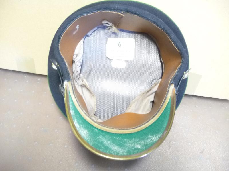 Stiff peaked cap with green cap band bearing brass badge of the IRISH GUARDS. Size 6 3/4. grade 8+