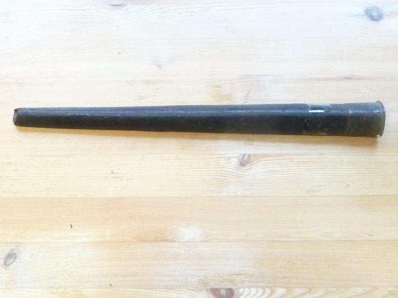 Brass throat and part of leather body of a Triangular socket bayonet. Frog stud loose ( held by tape). 14.5 inches overall, dirty, grade 7